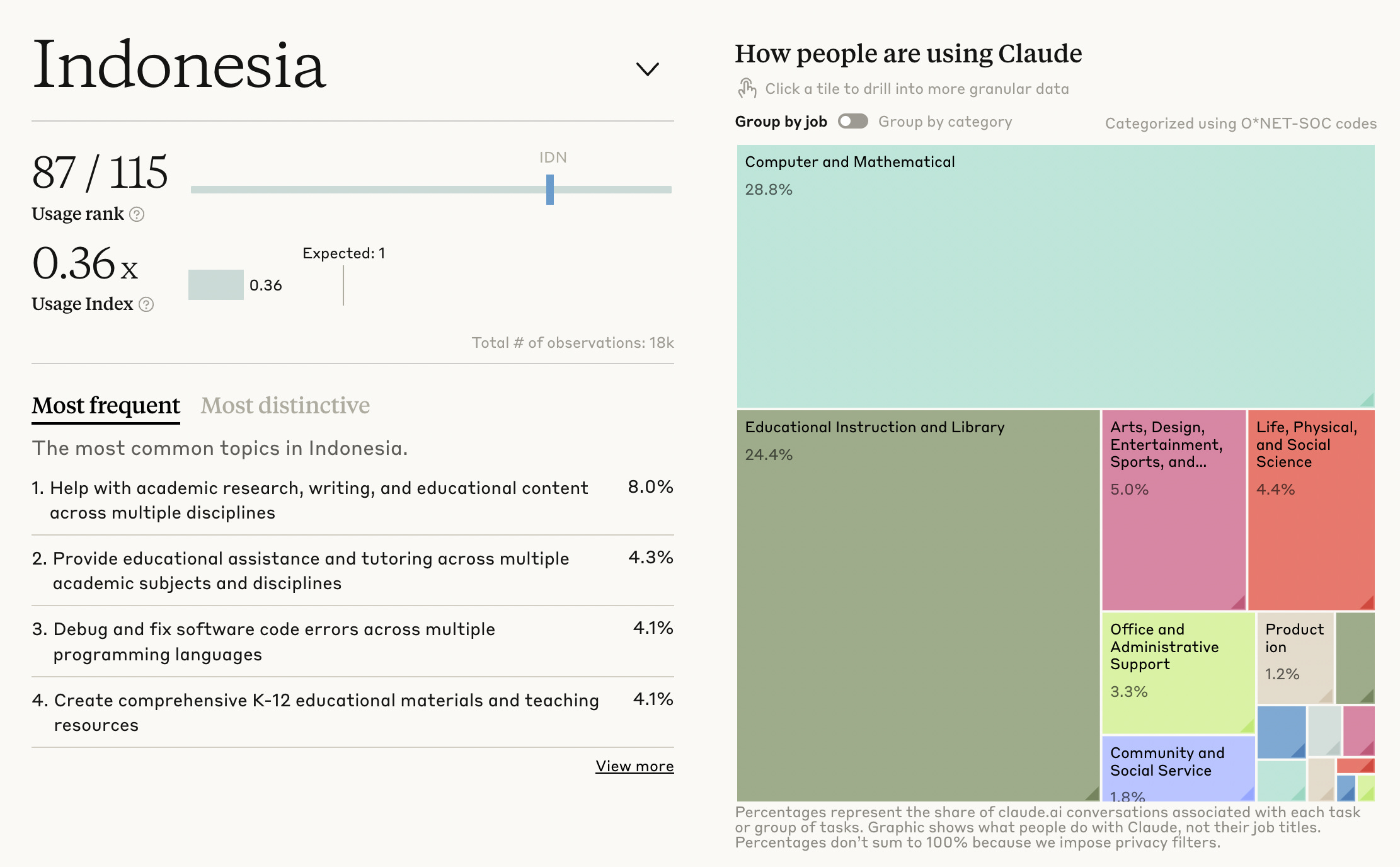 Ini adalah data penggunaan Claude di Indonesia. Menarik banget kalau dicompare dengan negara lain. Coba play-around disini: https://www.anthropic.com/economic-index#country-usage